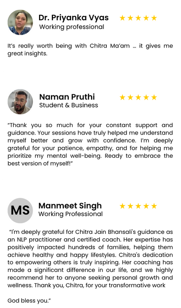 Hello! I’m Chitra Jain Bhansali, and I'm excited to guide you on your journey to mental clarity and emotional well-being. significantly on the mental, physical, and spiritual aspects of health.