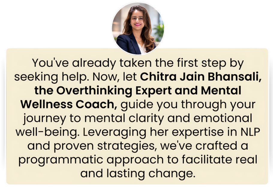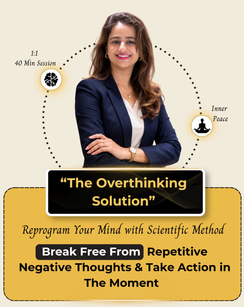 As an Overthinking Expert, Author and Mental Wellness Coach, I bring a wealth of knowledge and heartfelt experiences to my coaching. With a background in Science-Backed Tools and a deep understanding of the challenges working women face, I am dedicated to helping you break free from the cycle of overthinking and reclaiming your life. My mission is to empower women to achieve mental clarity, manage stress effectively, and live fulfilling lives.